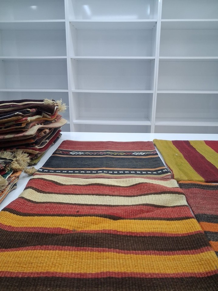 Koyu tonlarda çok renkli çizgili desenlere sahip geleneksel halı, mekâna renk ve doku katar. İstersenız. Adet. Sayısını. Cogaltabılırsınız. Yıkanmamış. Ürünler