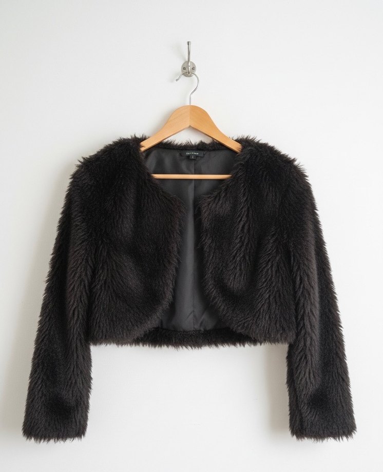 Bu kadın suni kürk ceket, uzun kollu ve rahat polar astarlıdır. Koyu renkte, desensiz, goth tarzı ve ofis kullanımına uygundur. Normal midi boyda, kesik yakalıdır.