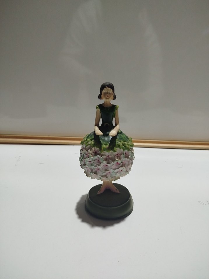 Koyu renklerde, çiçekli kaktüs üzerinde oturan figürin. Yuvarlak taban üzerinde doğa ve sanat birleşimi küçük heykel.