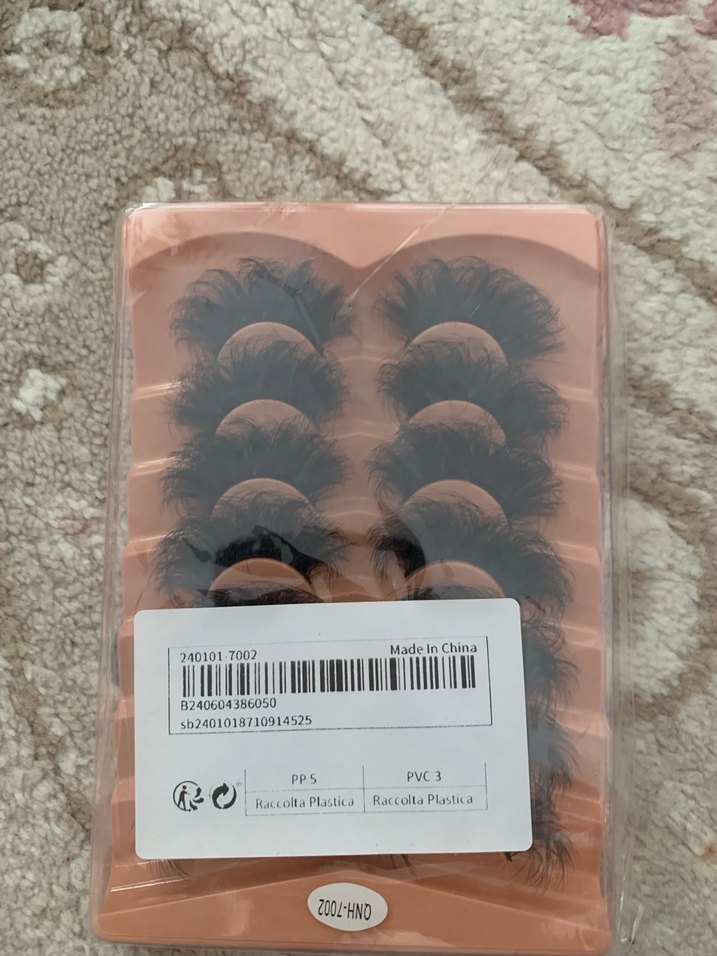Bej renkte paketlenmiş, koyu renkli çoklu sahte kirpik seti.