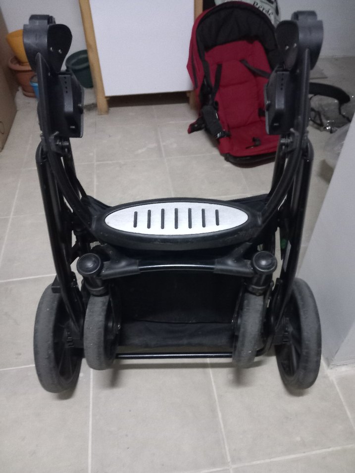 Dört tekerlekli sağlam iskeletli koyu siyah bebek arabası, alt kısmında geniş bir saklama sepeti bulunur.