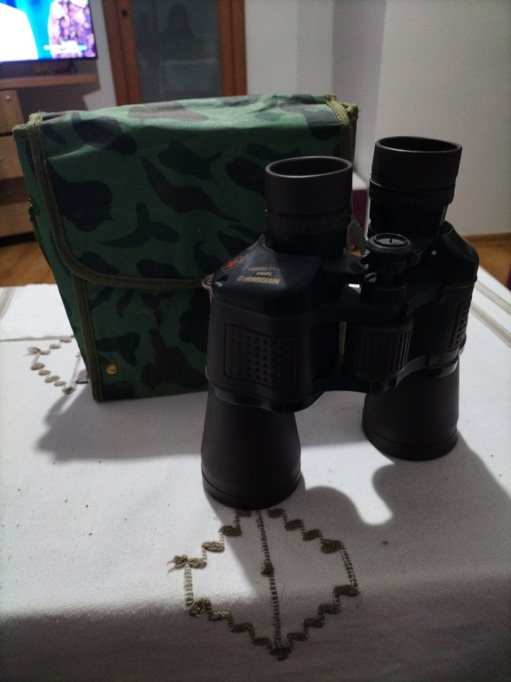 Siyah renkli dayanıklı dürbün, kamuflaj desenli taşıma çantasıyla birlikte gelir.