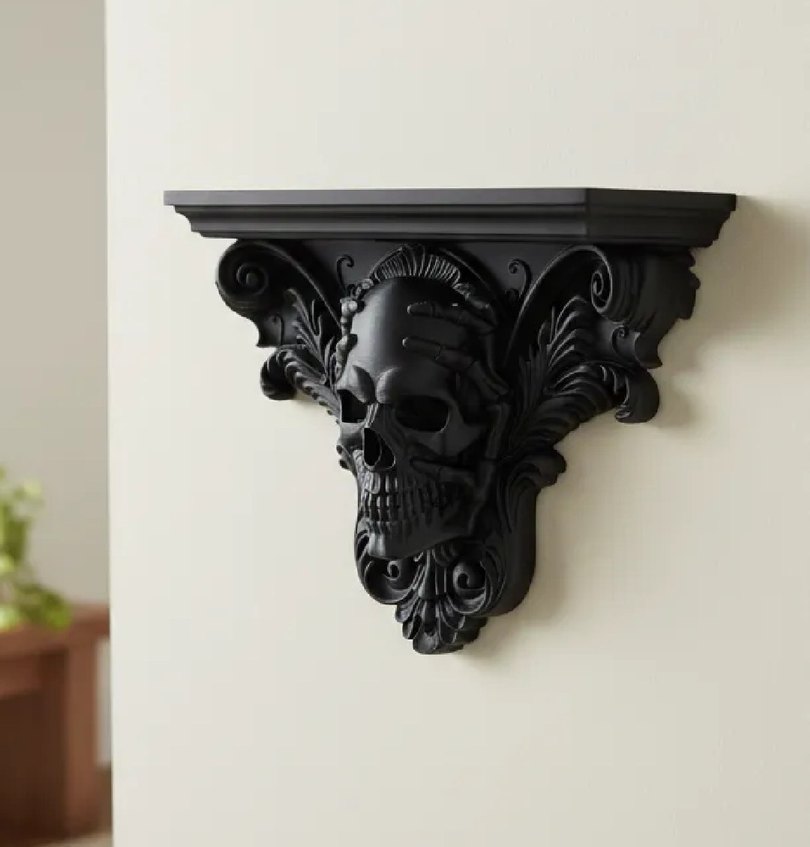 Koyu siyah renkte, detaylı kafatası figürlü ve süslü desenlere sahip dekoratif duvar rafı.