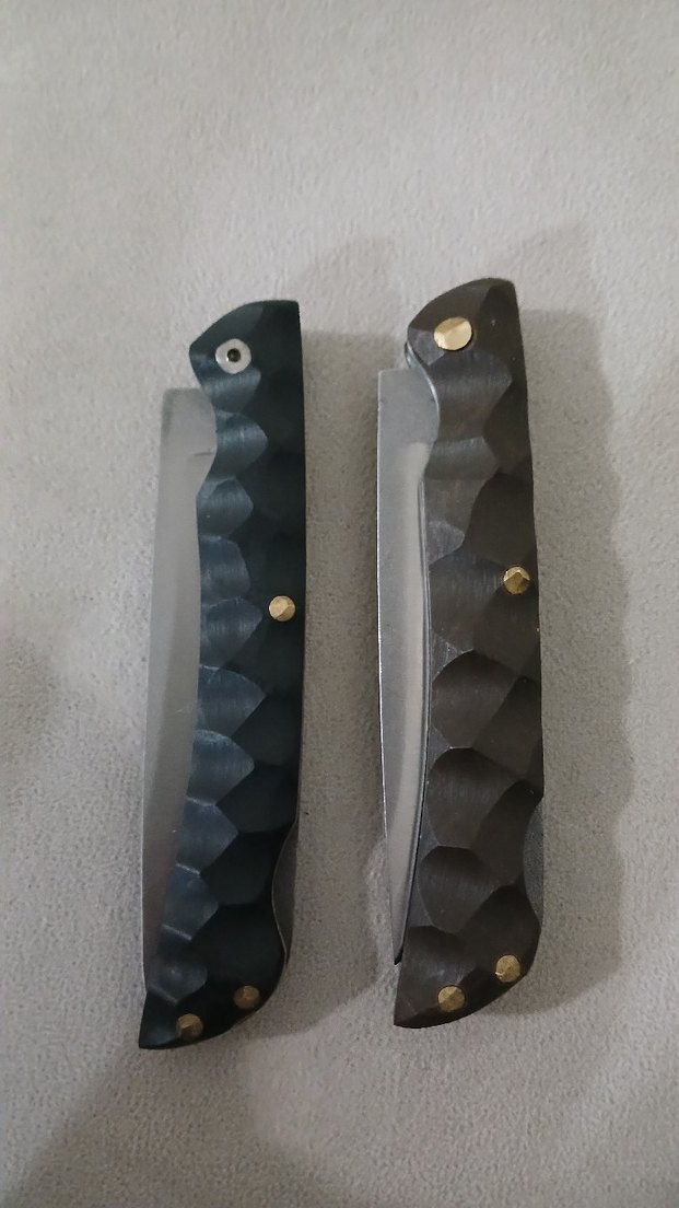 Dokuya sahip sapları ve metal perçinleri ile koyu siyah katlanır bıçak. Pratik kullanım için uygun.