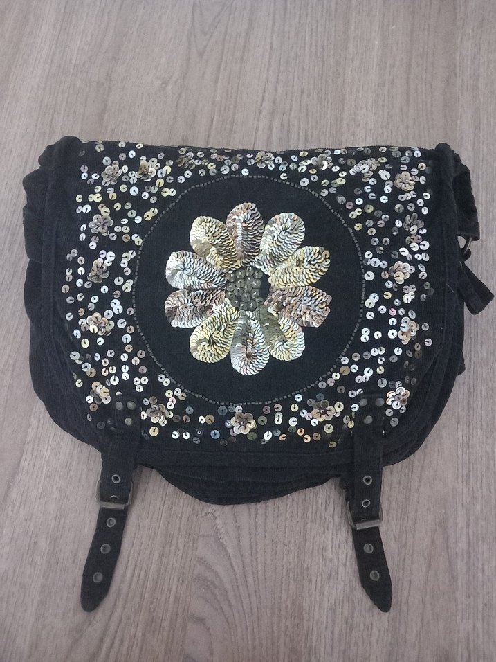 Koyu siyah kot kumaştan yapılmış, nakışlı ve tokalı kapaklı bohem tarzda kadın çantası. ✨