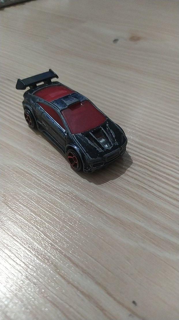 Koyu siyah renkte, tavan ve tekerleklerde kırmızı detaylara sahip oyuncak araba.Nadir özellik olarak onu kalkabiliyor