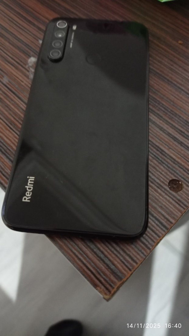 Koyu siyah renkte Redmi Android telefon, arka tarafta üçlü kamera ve parmak izi sensörü ile tasarlanmıştır.