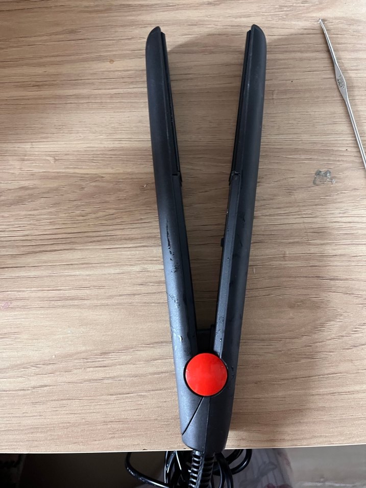 Koyu siyah renkte, kırmızı düğmeli saç düzleştiricidir. Saç şekillendirmek için uygundur.