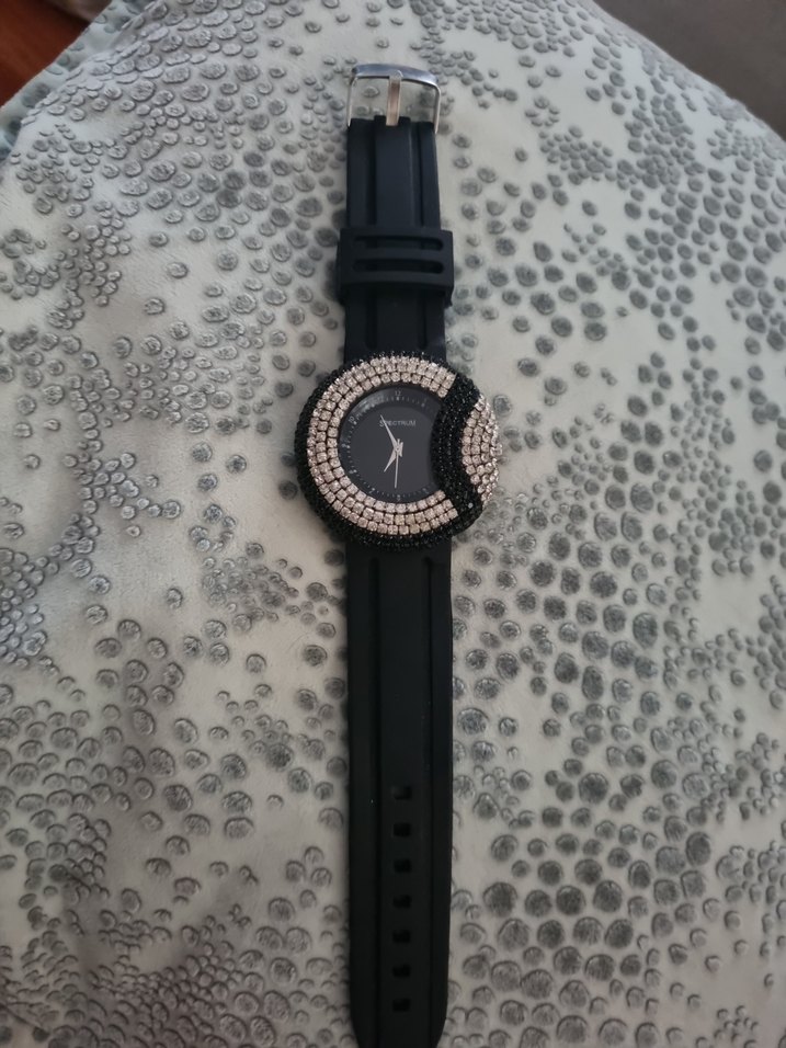 Koyu siyah kayışlı, taşlarla süslenmiş yuvarlak kadranlı, tokalı kadın kol saati. ⌚