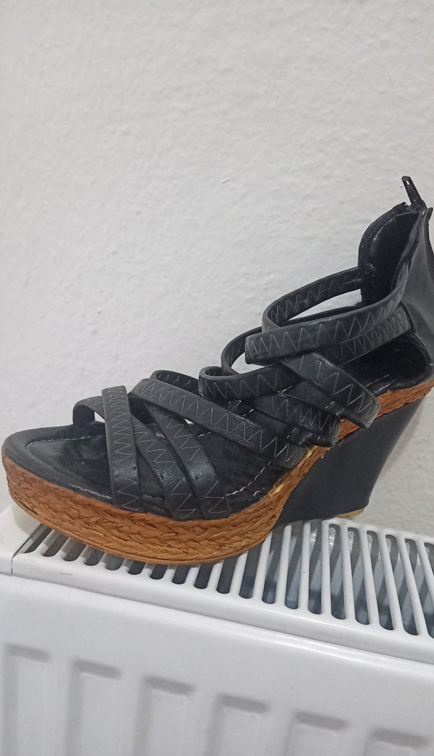 Kemer detaylı, yılan desenli siyah dolgu topuklu kadın ayakkabısı. Kauçuk malzemeden, günlük kullanıma uygun.