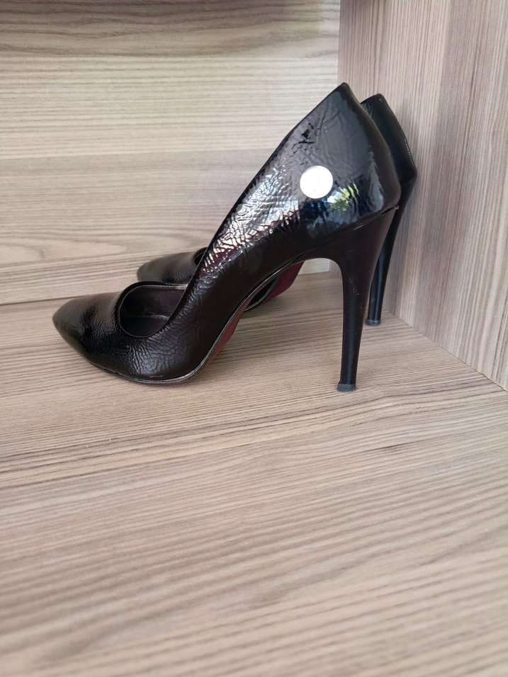 Koyu siyah yılan desenli, tokalı stiletto topuklu ayakkabılar. Lastik malzemeden, cesur ve gotik tarz için uygun. Romantik akşamlar için ideal.