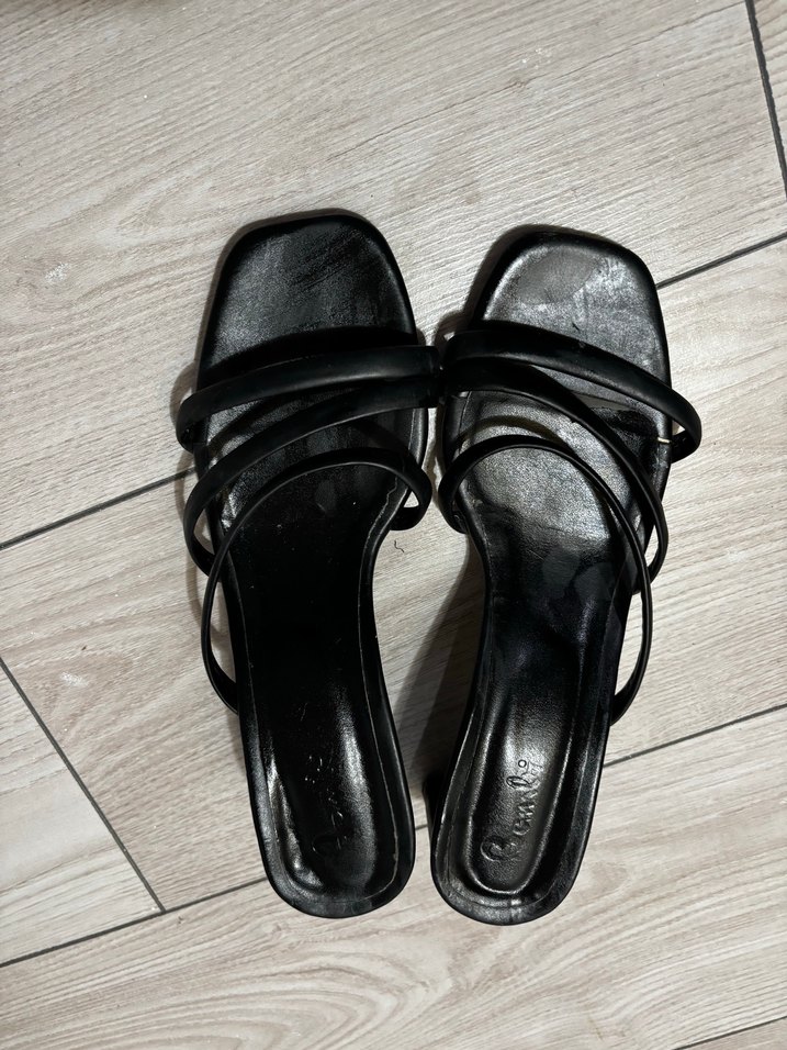 Koyu siyah yılan desenli, tokalı, kauçuk stiletto topuklu ayakkabı. Gotik ve avangard tarz için uygun, günlük kullanıma ideal.