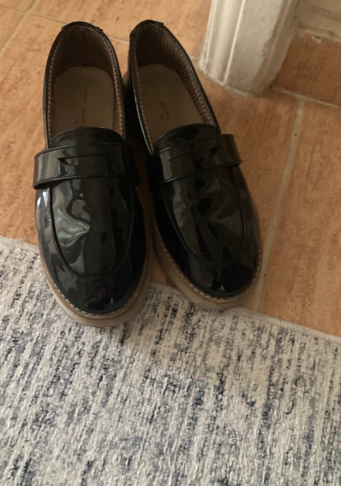 Koyu siyah yılan desenli, tokalı ve topuklu kauçuk loafer. Günlük kullanıma uygun, trend ve gotik tarzı yansıtır.
