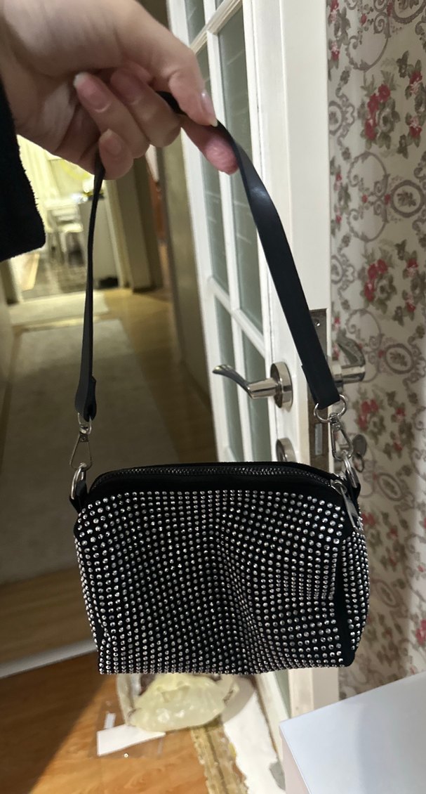 Suni kumaştan yapılmış, tokalı askılı ve zımbalı tasarımlı koyu siyah yılan desenli kadın çantası. Rock punk tarzına uygun.