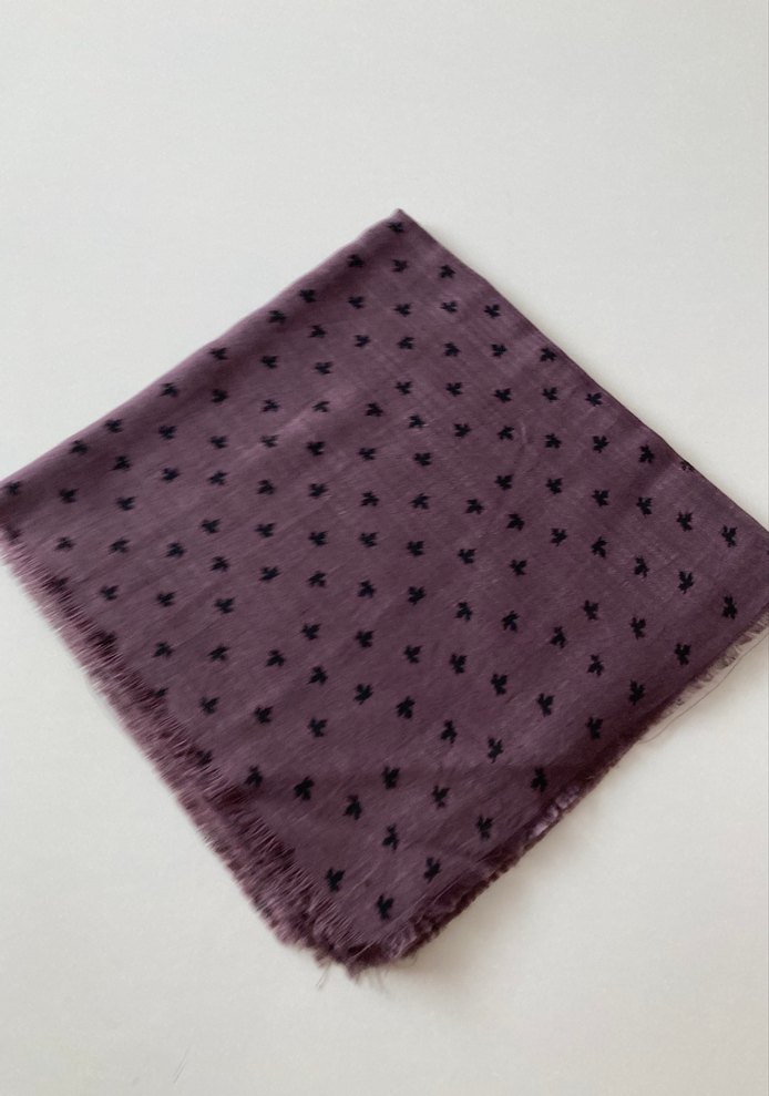 Koyu mor renkte, sentetik kumaştan, fırfırlı ve küçük desenli kadın atkısı, bohem tarzına uygun.