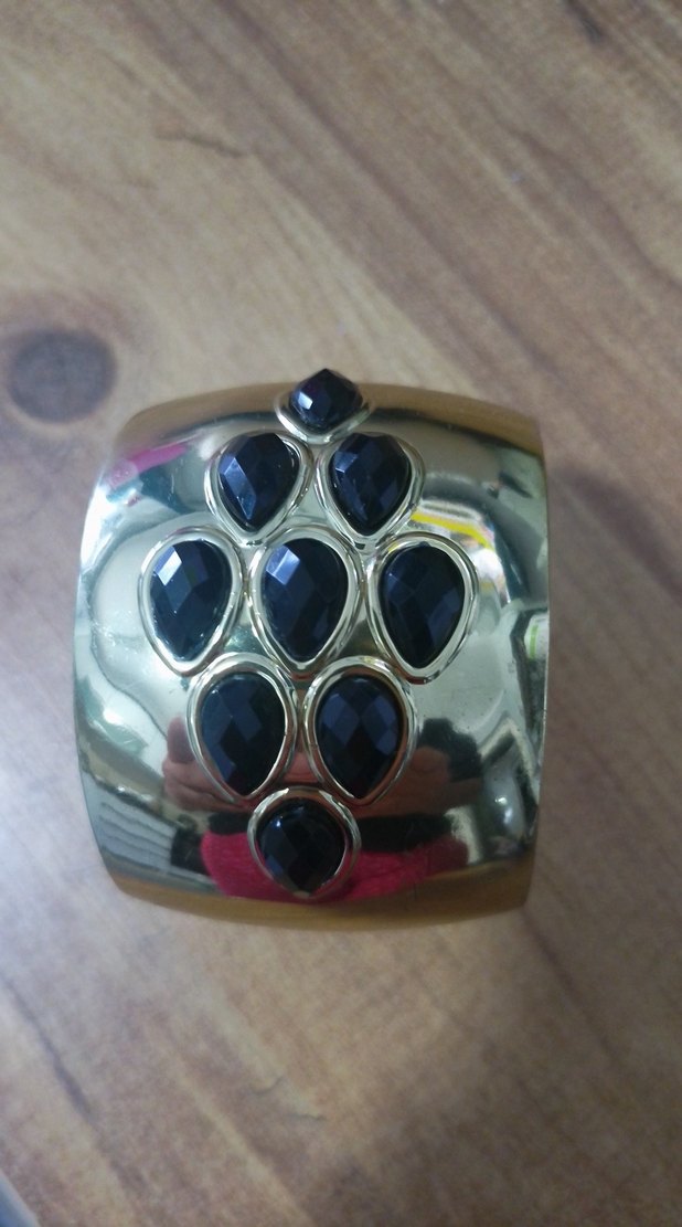 Koyu taşlarla süslenmiş altın renkli, tokalı bilezik. Modern desenli ve gösterişli tasarıma sahip.