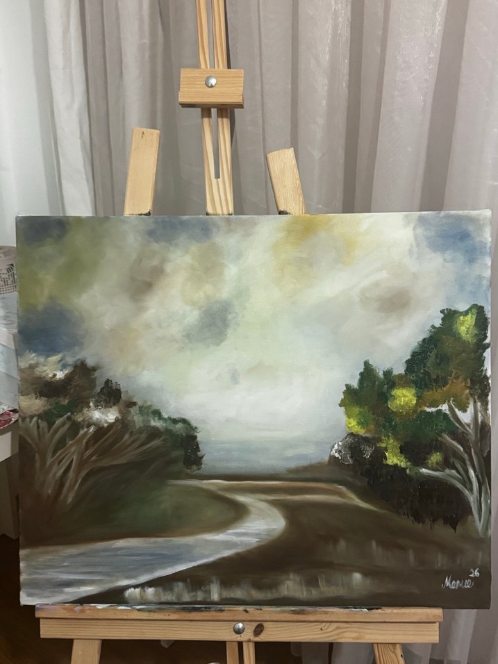 Koyu tonlarda, kıvrımlı bir nehir ve ağaçların yer aldığı, bulutlu gökyüzü altında doğa manzarası yağlı boya tablo.