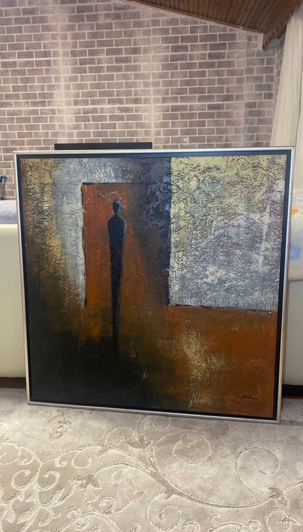 Koyu kahverengi ve gri tonlarda, dokulu yüzeye sahip soyut tabloda gölgeli bir insan figürü yer alıyor.orijinal imzalı fakat kime ait olduğunu bilmiyorum .105 e 105 boyutunda.