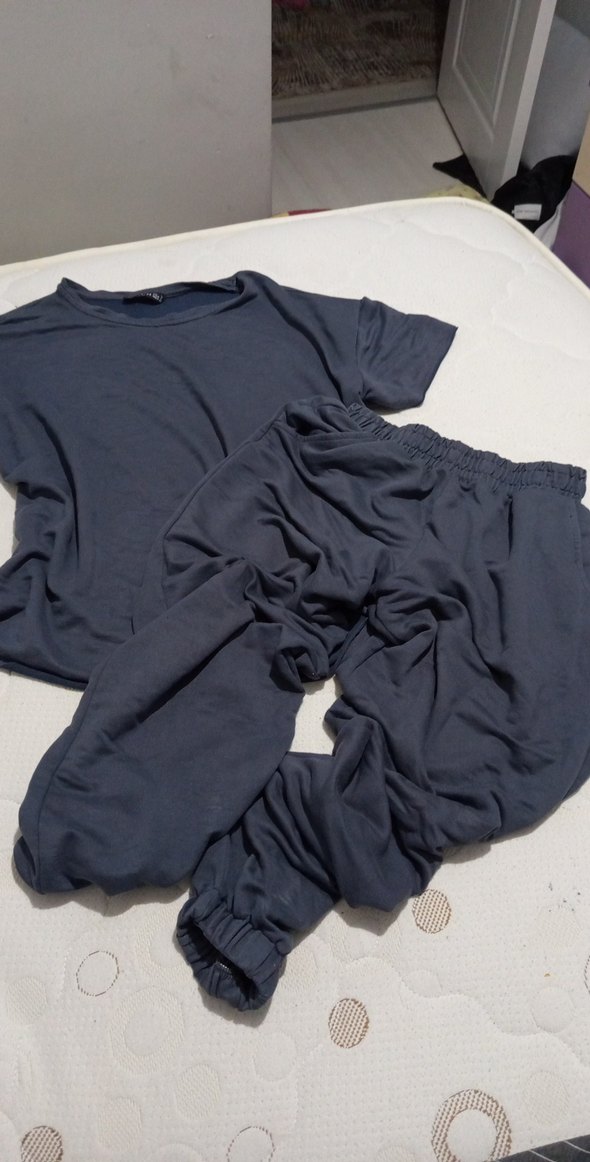 Gri renkte, kısa kollu ve yuvarlak yakalı kadin takımı. Rahat kesimi ve basic tasarımıyla gündelik kullanıma uygundur.