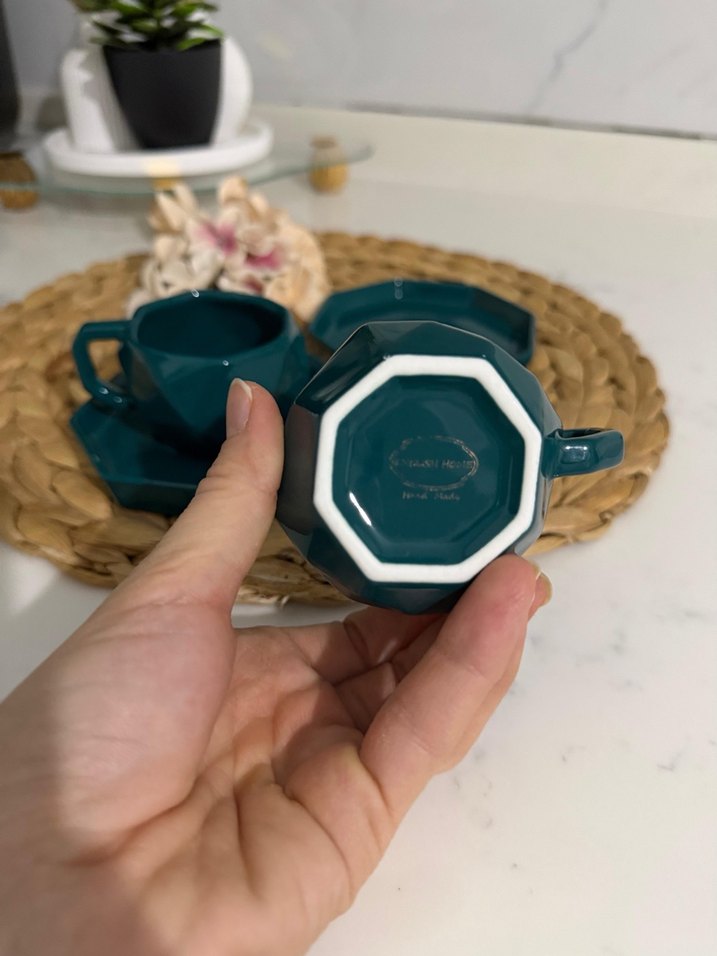 Koyu turkuaz renkli, altıgen şekilli seramik fincan ve tabak takımı. Kulplu ve parlak yüzeye sahip, espresso için uygun. ☕ SAdece BİR KERE KULLANILDI YENİDEN FARKSIZ
