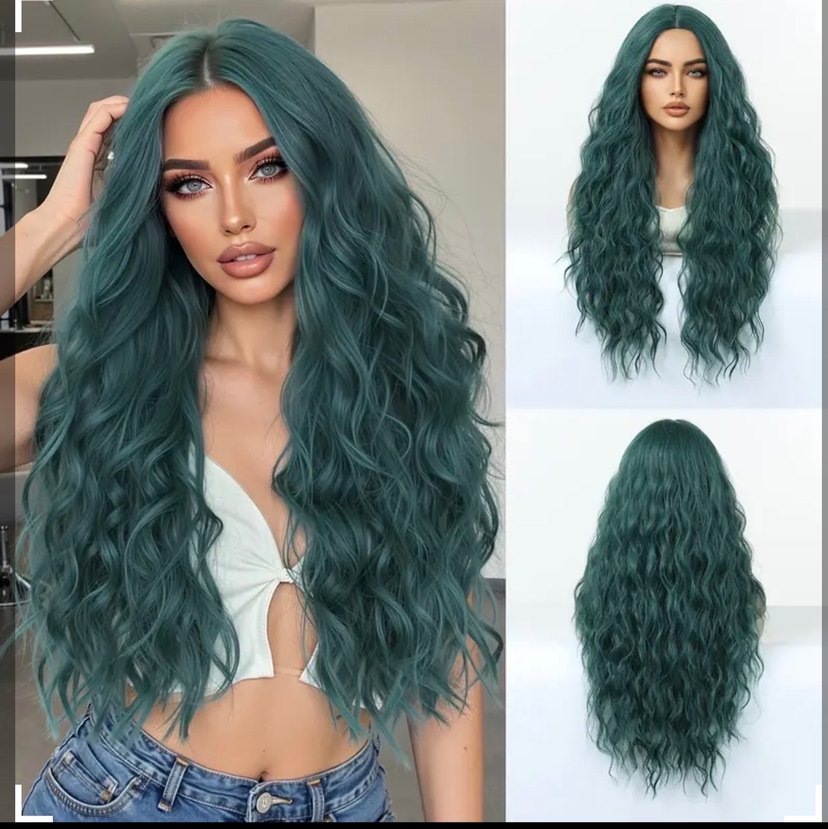 Koyu turkuaz renkte, uzun ve dalgalı sentetik peruk, bohem tarzında zahmetsiz şıklık sunar. Hipi ve retro görünümler için uygundur.
