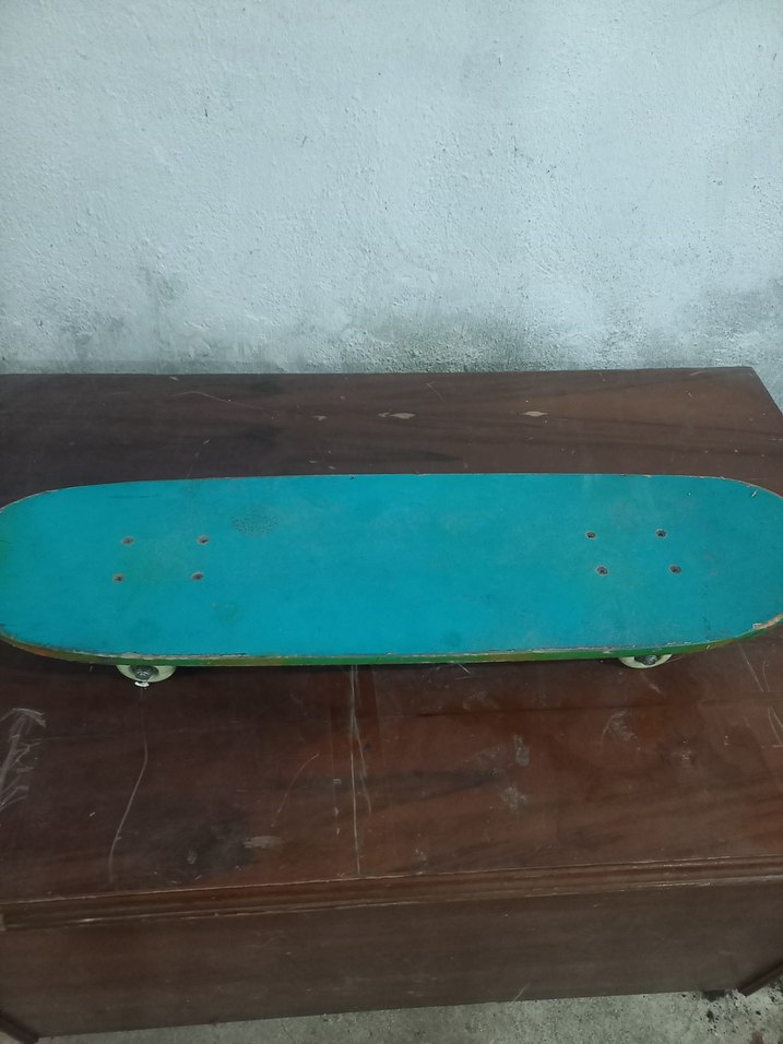 Koyu turkuaz renkte, çocuklar için tasarlanmış sağlam kaykay. Düzgün sürüş için dayanıklı tahta ve tekerlekler içerir.