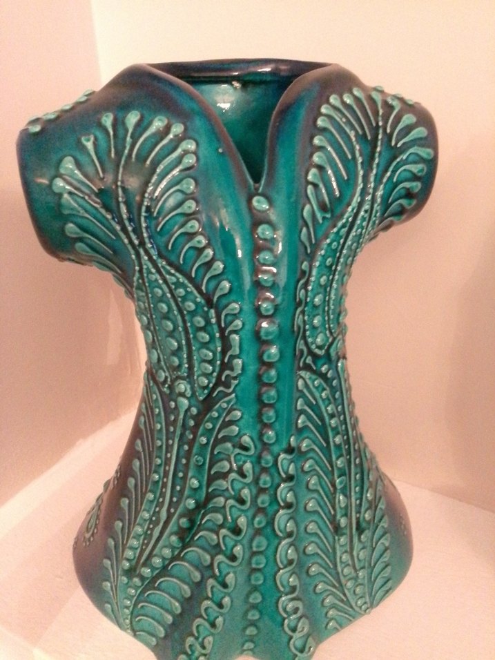 Koyu turkuaz renkte, kabartmalı desenlere sahip seramik vazo. Benzersiz şekliyle dekoratif bir görünüm sunar.