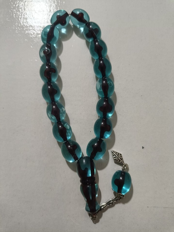 Koyu turkuaz renkte, yuvarlak taneli ve dekoratif püsküllü erkek tesbih. Minimalist ve bohem tarzda şık bir aksesuar.