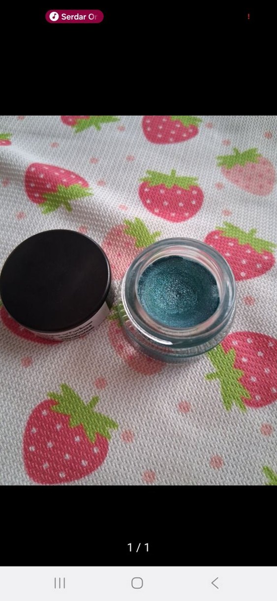 Küçük siyah kapaklı kavanozda koyu turkuaz göz farı, canlı renk sunar. ürün bir kaç defa kullanıldı
