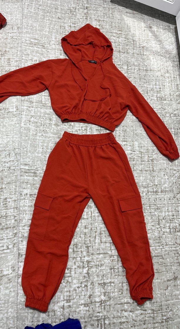Koyu turuncu renkli, V yakalı, uzun kollu kapüşonlu üst ve cep detaylı midi boy pantolonlu, rahat kesim kadın eşofman takımı. Yumuşak ve sıcak kumaştan üretilmiştir. Sıfır