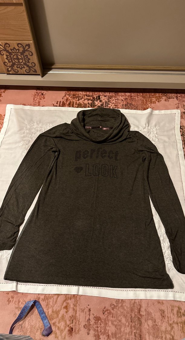 Vizon renkli, uzun kollu, yumuşak penye dokuma hamile bluz. Boğazlı yaka ve rahat kesime sahip. Yakası bohem bir görünüm olarak da kullanılabilir omuzlar açık carmen yaka olarak da kullanılabilir esnekliktedir. Önünde "PERFECT LOOK" baskısı bulunur. Midi boyda, günlük rahat stil için uygun. Elbise ya da tunik olarak kullanılabilir. Esnektir. Boyu 70cm
