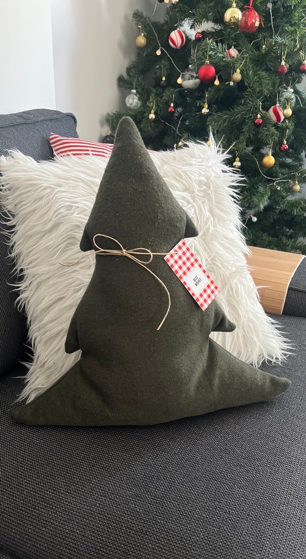 Yumuşak yünden yapılmış, ağaç şeklinde koyu yeşil yılbaşı yastığı, işlemeli desene sahiptir ve odanıza sıcaklık katar.