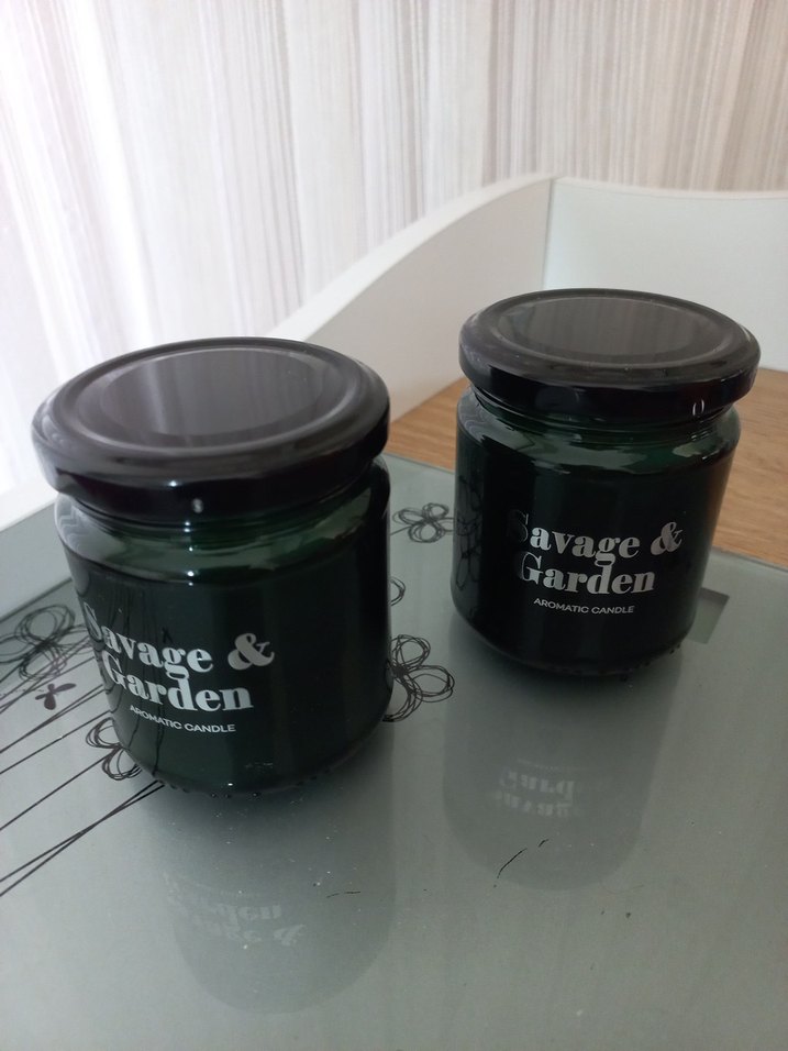 Koyu yeşil cam kavanozlarda, siyah kapaklı 'Savage & Garden' yazılı aromatik mumlar. ️