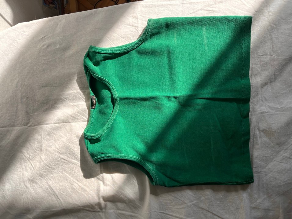 Tok kumaştan yapılmış koyu yeşil atlet, katmanlama için uygun.