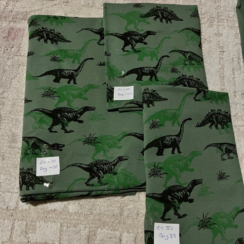 Koyu yeşil renkte, dinozor desenli çocuk kumaşı