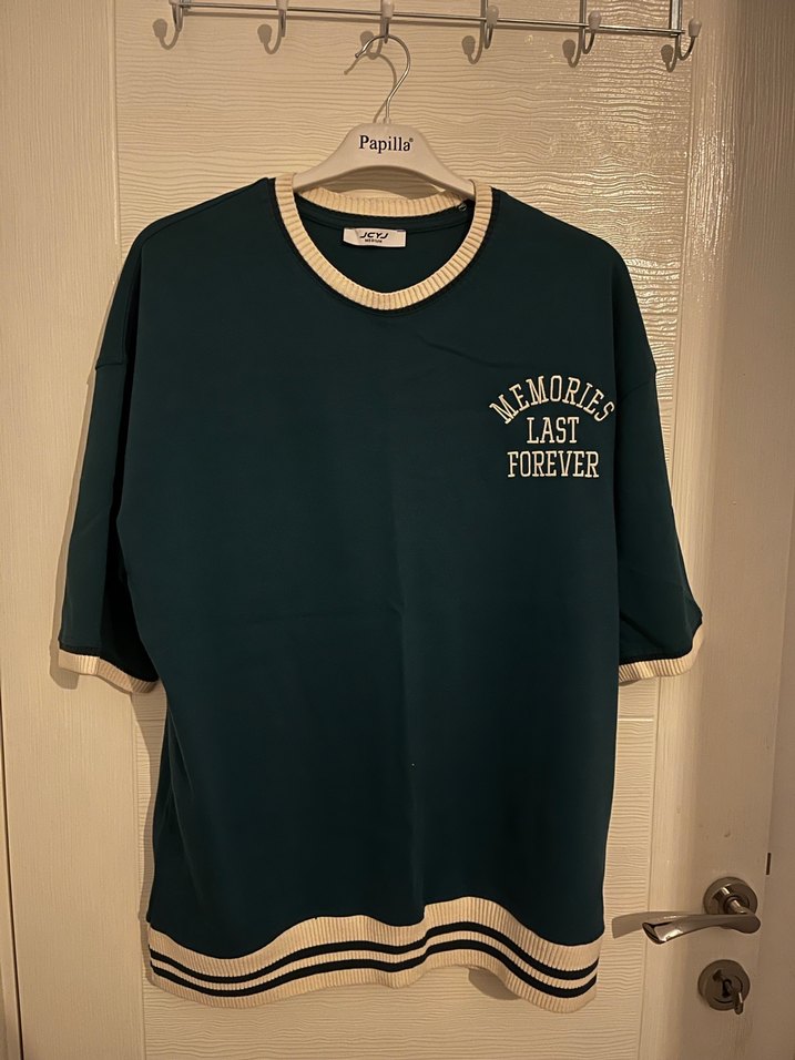 Koyu yeşil, kısa kollu, bisiklet yaka erkek tişörtü. 'MEMORIES LAST FOREVER' baskılı, oversize kesim ve yumuşak, sıcak kumaştan üretilmiştir.