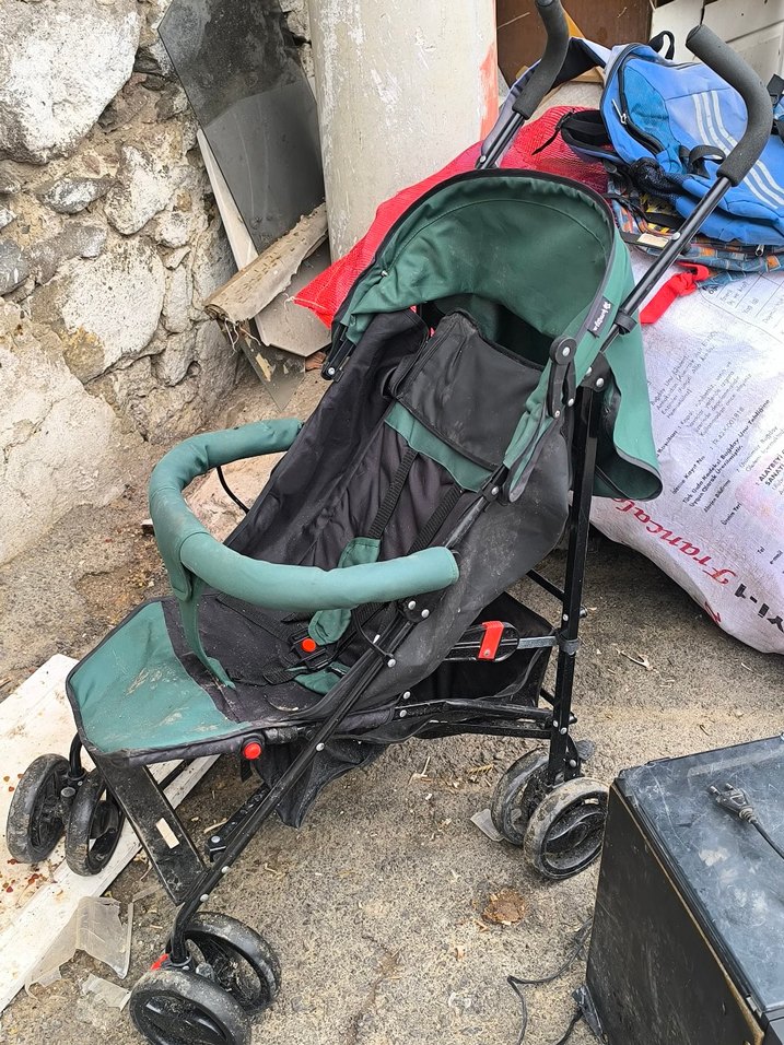 Koyu yeşil bebek arabası, güvenlik kemeri ve yumuşak ön bar içerir. Dört çift tekerlekle rahat sürüş sağlar.