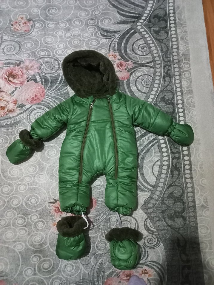 Koyu yeşil renkli, yumuşak ve sıcak kumaş astarlı bebek kayak tulumu, fermuarlı ön kısmı ve bağlı eldivenleri ile ekstra koruma sağlar.