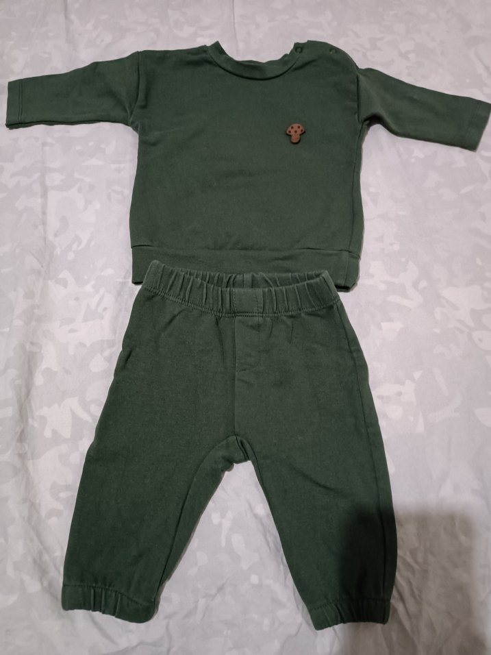 Koyu yeşil, uzun kollu bisiklet yaka üst ve pantolondan oluşan bebek takımı. Yumuşak ve sıcak kumaştan, sade ve şık sokak stilinde, göğsünde küçük mantar detaylı.