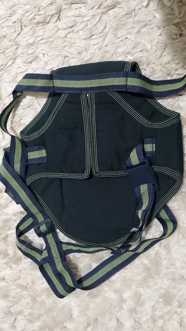Çizgili askılı koyu yeşil bebek taşıyıcı, rahat taşıma için ayarlanabilir destek sağlar.