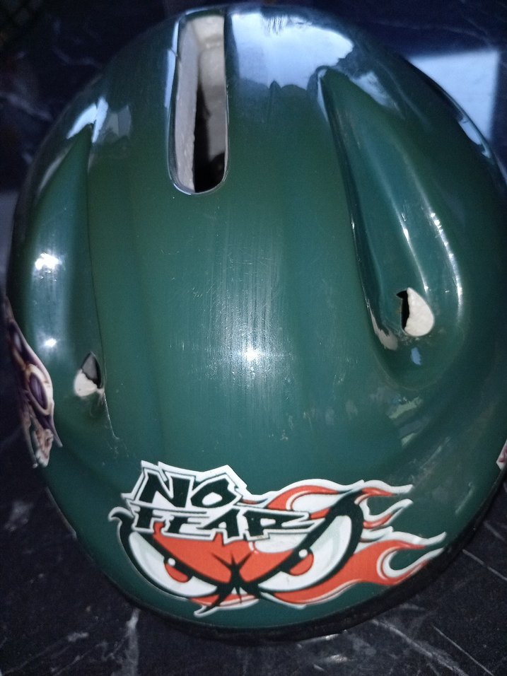 Koyu yeşil renkli, baskılı desenli plastik bisiklet çocuk kaskı, tokalıdır. Grunge punk tarzı ve rock punk havası taşır. ️