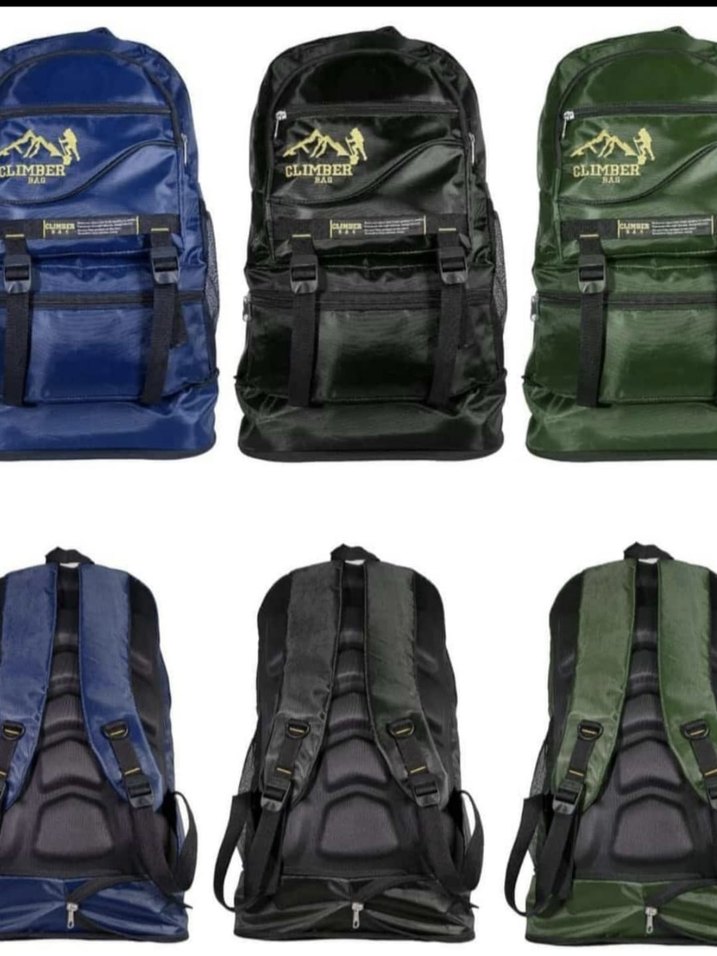 Koyu yeşil biker tarzı sırt çantası, fermuarlı bölmeler ve 'CLIMBEI' baskılı logo içerir. Trendy casual street style için uygundur.