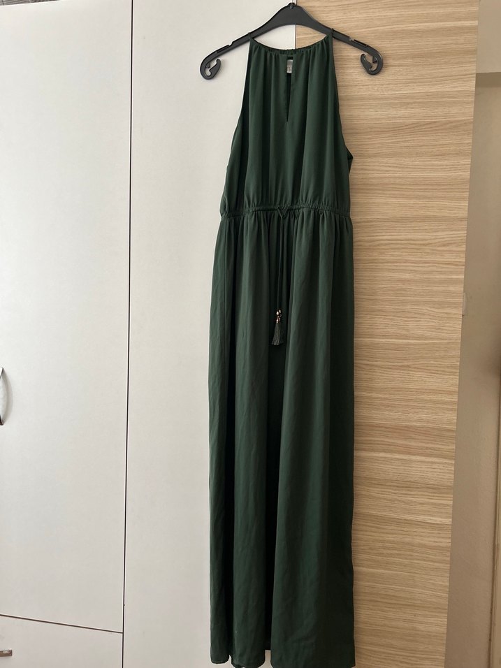 Koyu yeşil renkli, kolsuz uzun elbise hm marka etiketliydi hiç giymedim aldığımda ucunda leke varmış çıksın diye makineye attım etiketi gitti