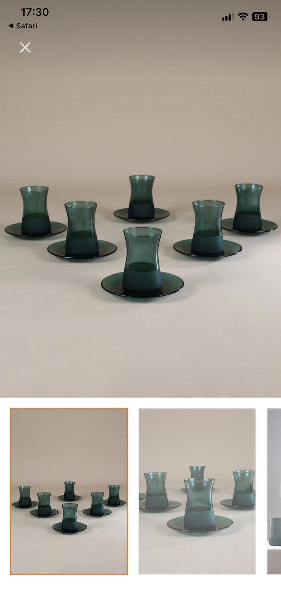 Altı adet koyu yeşil cam çay bardağı ve tabaklarından oluşan set, çay servisi için uygundur.