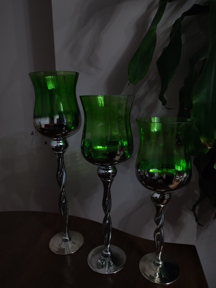 Kıvrımlı gümüş saplı, koyu yeşil camdan yapılmış üçlü mumluk seti ️. fotoğraflarda belirttiğim gibi yeşil kısımlarının bazı yerlerinde soyulmalar var,çok belli olmuyor