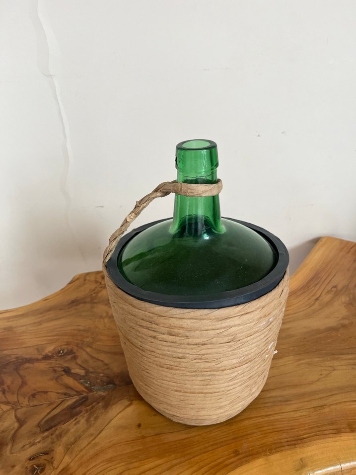 Koyu yeşil camdan yapılmış, doğal lifle sarılı ve taşıma sapı bulunan vazo. Ürün yurt dışından geldi hiç kullanılmadı.
