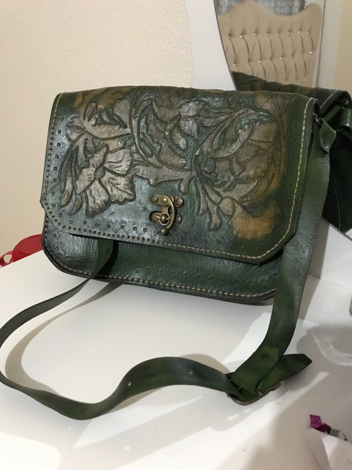 Koyu yeşil deri çapraz çanta, çiçek desenli ve vintage tokalı tasarımıyla bohem tarzı yansıtıyor. El yapımı ve hakiki deri