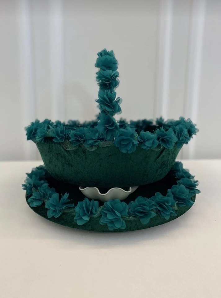 Koyu turkuaz renkte, çevresi kumaş çiçeklerle süslenmiş sepet ve tabağıdır.