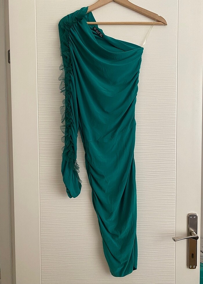 Yalnızca 1 kere giyildi üzerimdeki duruşu son fotoğrafta görülebilir dileyen mini dileyen diz altı kullanabilir Esnek bir kumaşı var tek omuz çok şıktır 36 38 beden için uygundur