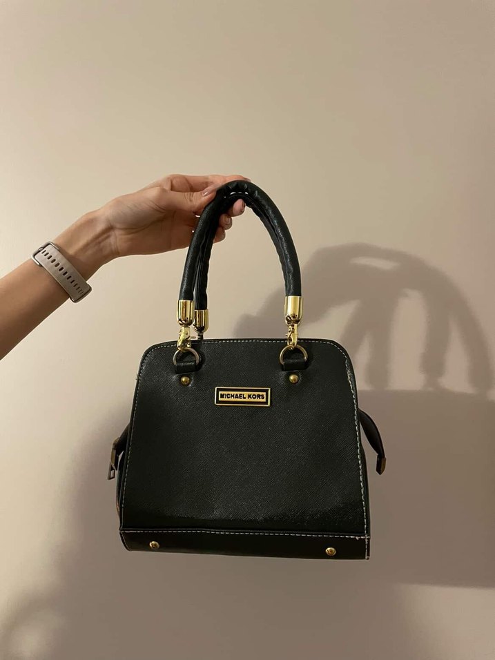 Michael Kors marka, tokalı, parlak deri kadın çantası. Minimalist gotik tarzıyla günlük kullanıma uygun.